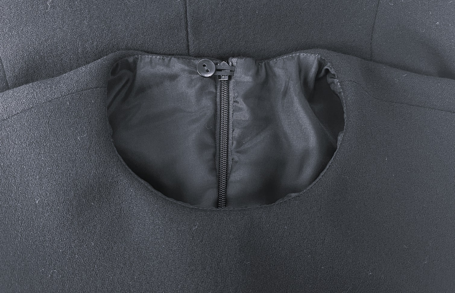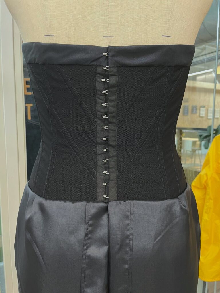 Gebaseerd op een cocktailjapon uit de 1956 F/W collectie van de ontwerper Christiaan Dior. De japon word ondersteund door een korset.