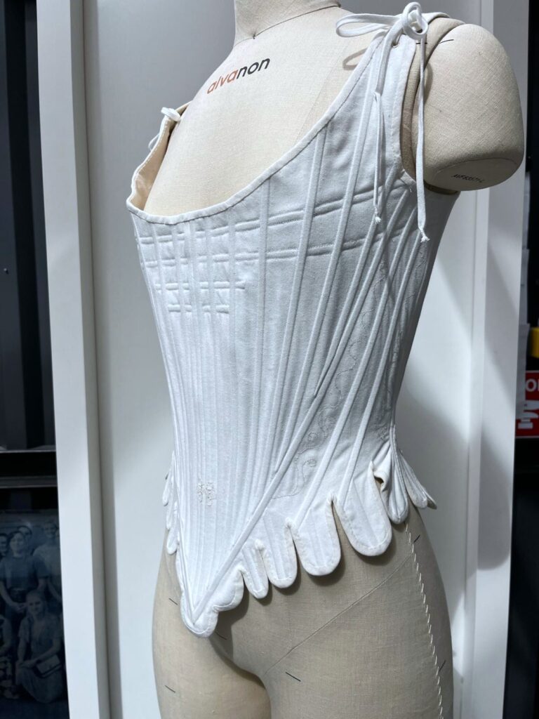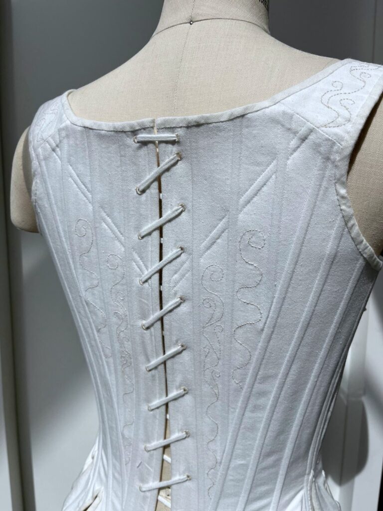 Gebaseerd op een keurslijf patroon uit 1775. Vrijwel alles met de hand gestikt en voeringstof gekleurd met thee.