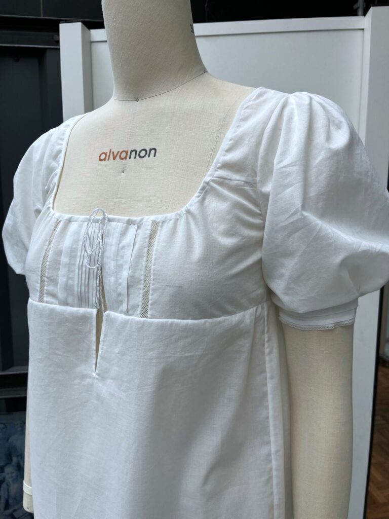 Gebaseerd op een verzameling van referentiemateriaal voor chemisen rond 1810. Bevat veel handwerk en zelf ontworpen en gemaakt kantkloswerk.